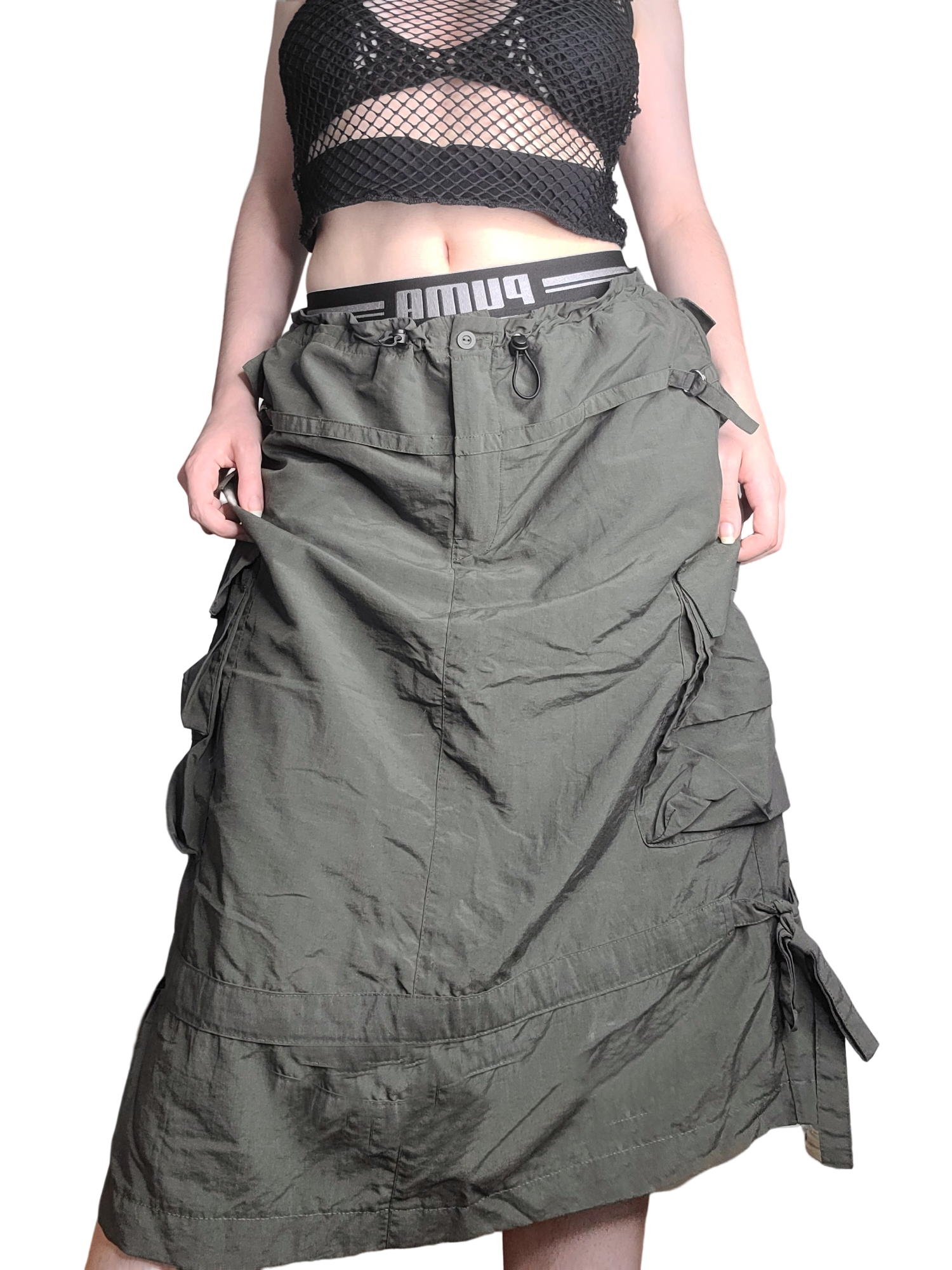 Belle jupe parachute cargo kaki gorpcore. Cordons de serrage à la taille et au bas de la jupe, élément techwear à la taille, multipoches. Doublure filet.